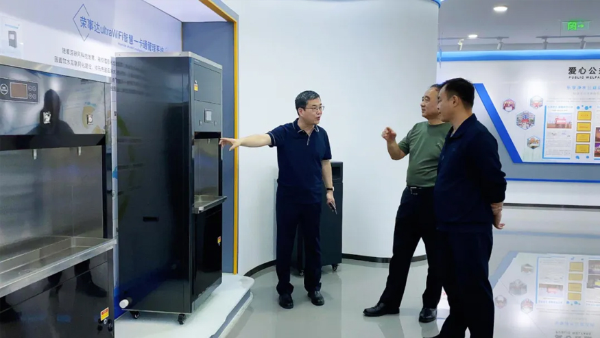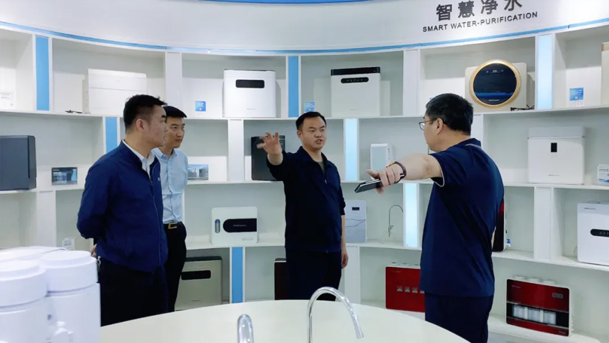 領(lǐng)導(dǎo)一行參觀了解集團(tuán)的全屋智慧凈水項(xiàng)目、社區(qū)智慧飲水項(xiàng)目以及校園直飲水項(xiàng)目等。