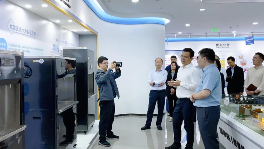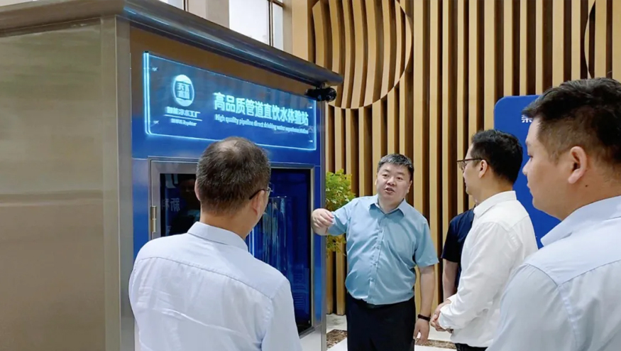 總經(jīng)理王悅生向領導一行介紹管道直飲水項目:該項目針對社區(qū)、學校、醫(yī)院、企事業(yè)單位及工廠等場景,提供定制化飲水模式,涵蓋社區(qū)智慧水站、校園智慧凈水屋、高端直飲水設備及變頻供回水系統(tǒng),旨在為民眾打造便捷、高端、健康的飲水服務。